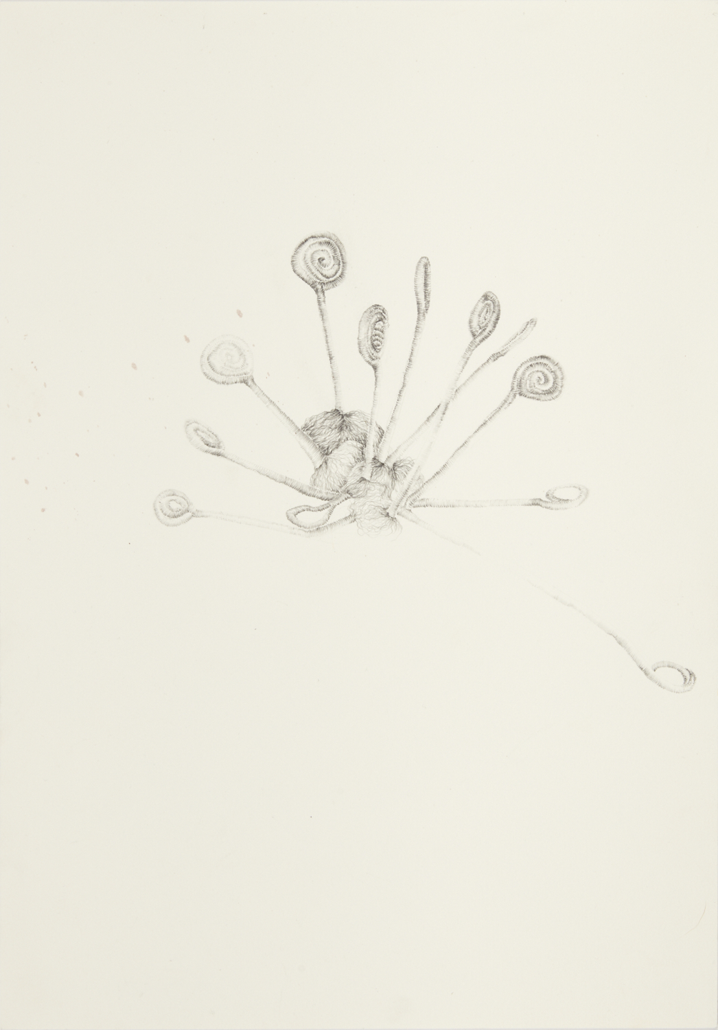 Temitayo Ogunbiyi, in her strange drawings, uses hybrid forms whose academic line evokes the thread, the textile and the capillary. Mixing ethnological and botanical references, the artist tries to find a path in a fragile balance between her personal history and the movements of History in the broadest sense.