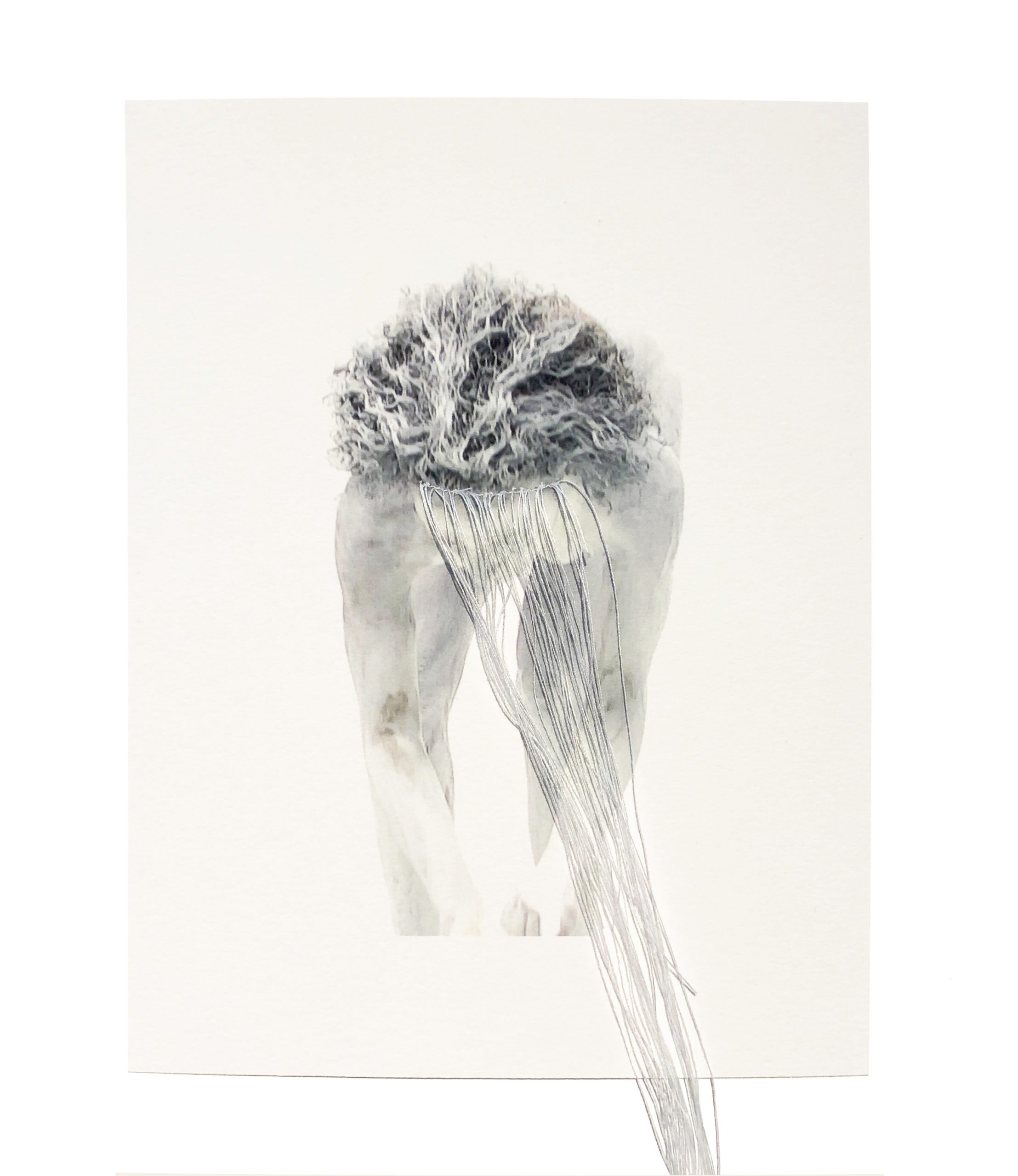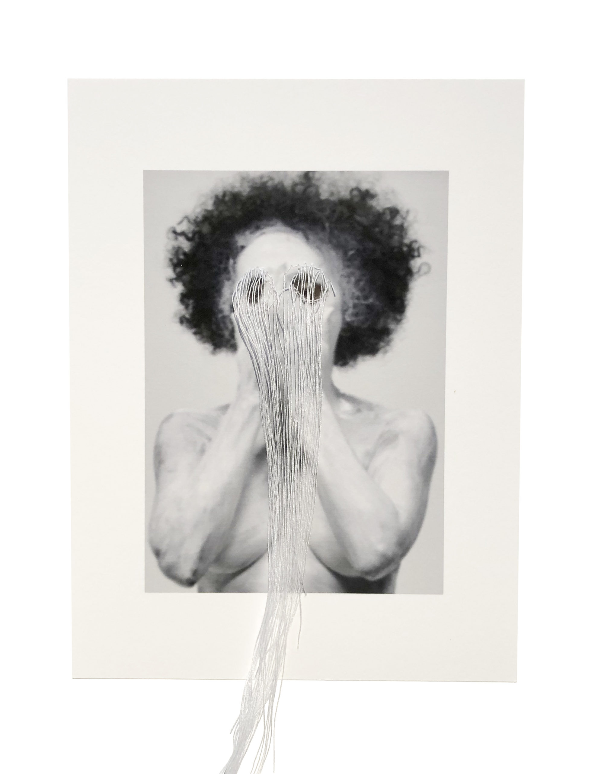 M’barka Amor showcases a series of photographs painted and sewn with white silk thread. These images are from the video performance “Now I’m white” questioning the place of the black body by drawing inspiration from the practice of “blackface” and minstrel shows, the racist performances of the 19th century.