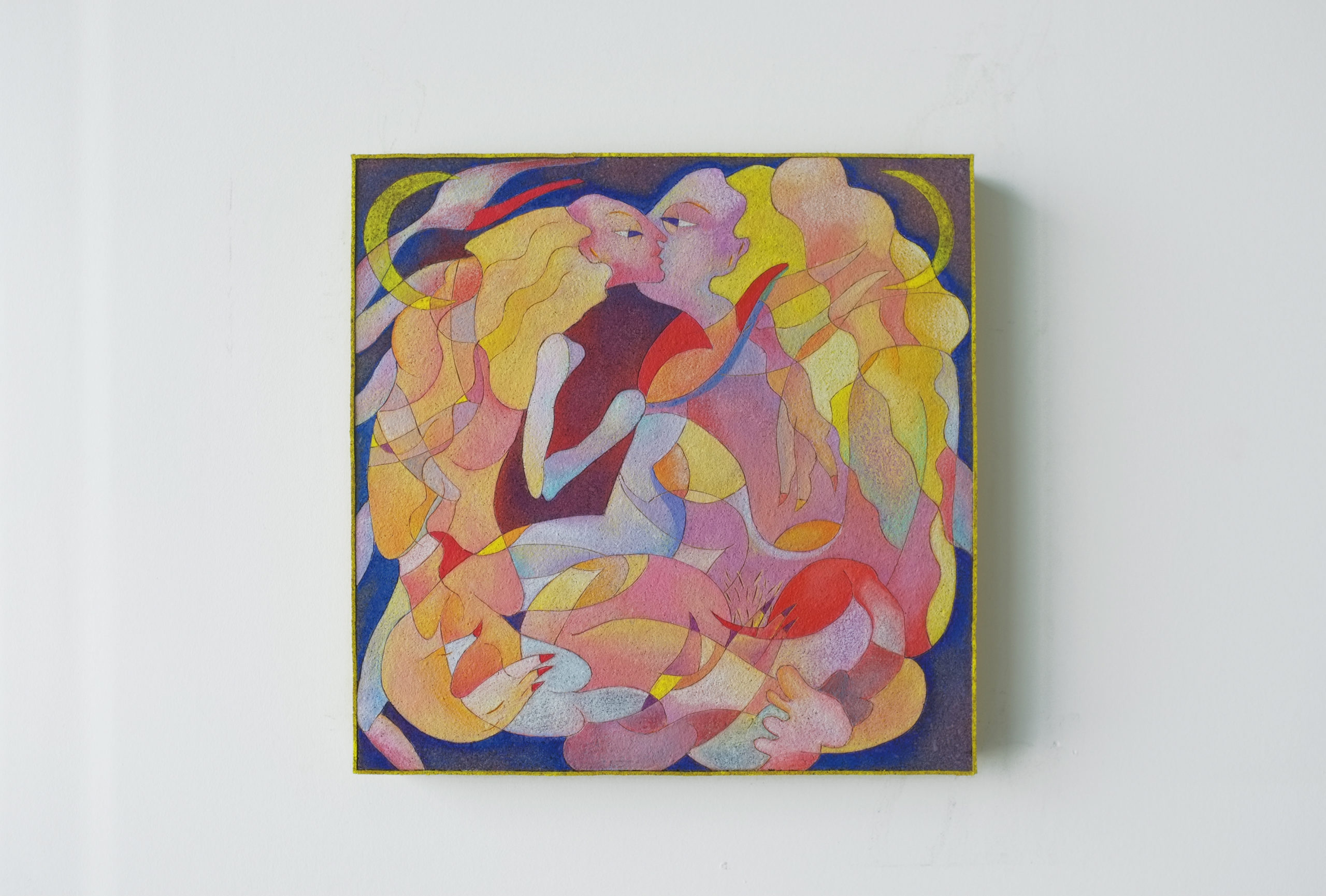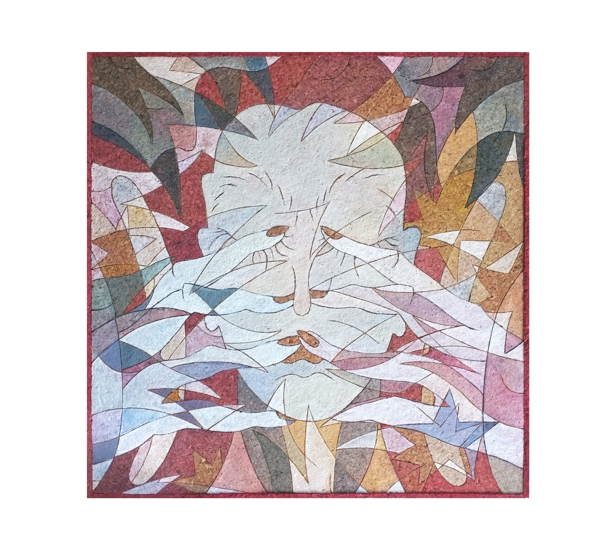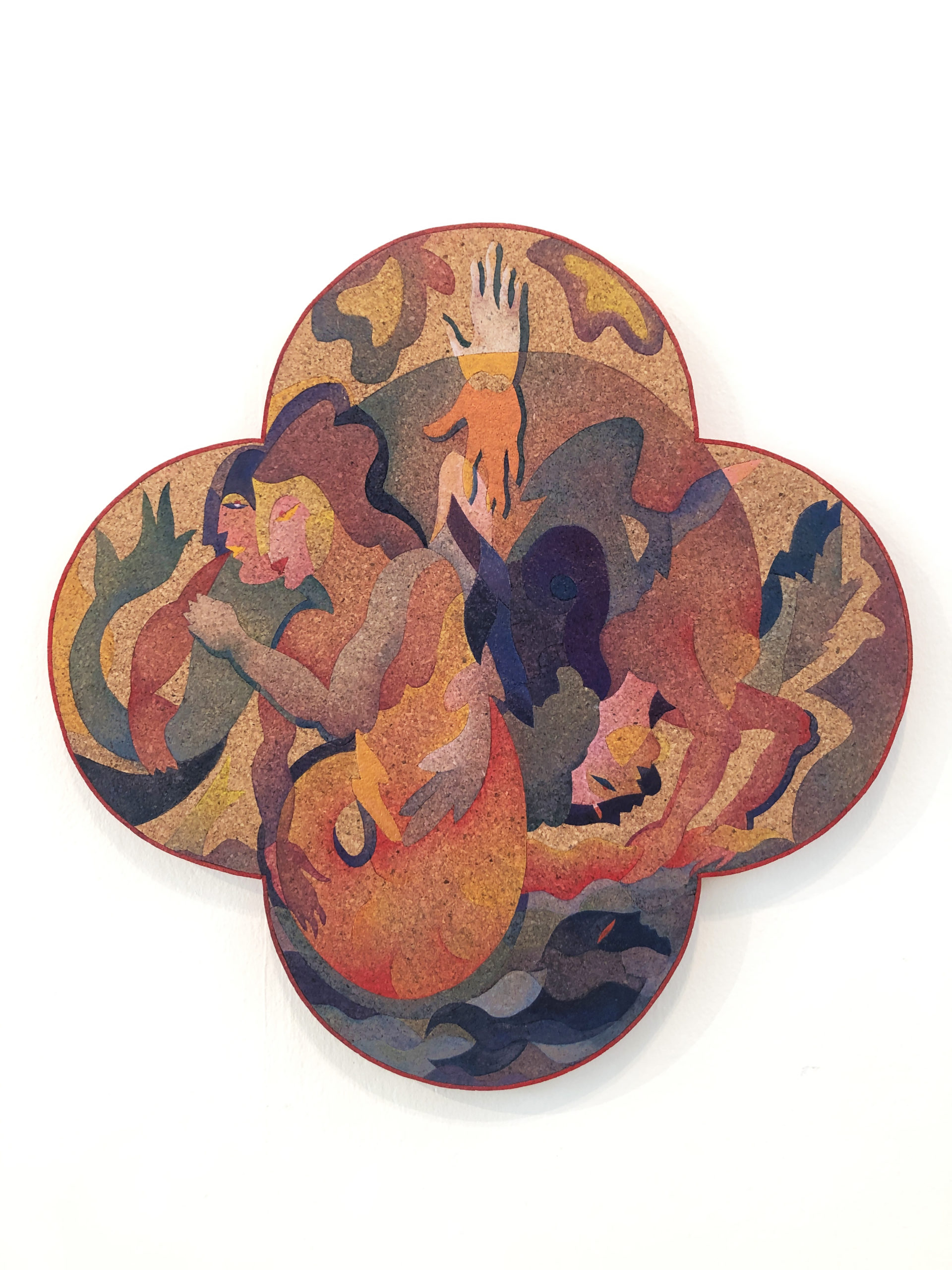 The use of cork follows Bonafini’s interest in the use of materials that have a softness to them, which can be stained and have a prominent texture of their own, commonly used by artisans, In this case cork is used in interior design, as insulation, and in the wine and fashion industry. It is a sustainable material, leaving the tree unharmed, harvested every 9 years from the cork oak tree. The subject matter of these works is entangled with the artist’s fascination of Etruscan imagery, and the mysteries related to this Ancient Italian civilisation, whose tomb and ceramic paintings are fresh with life and magic.