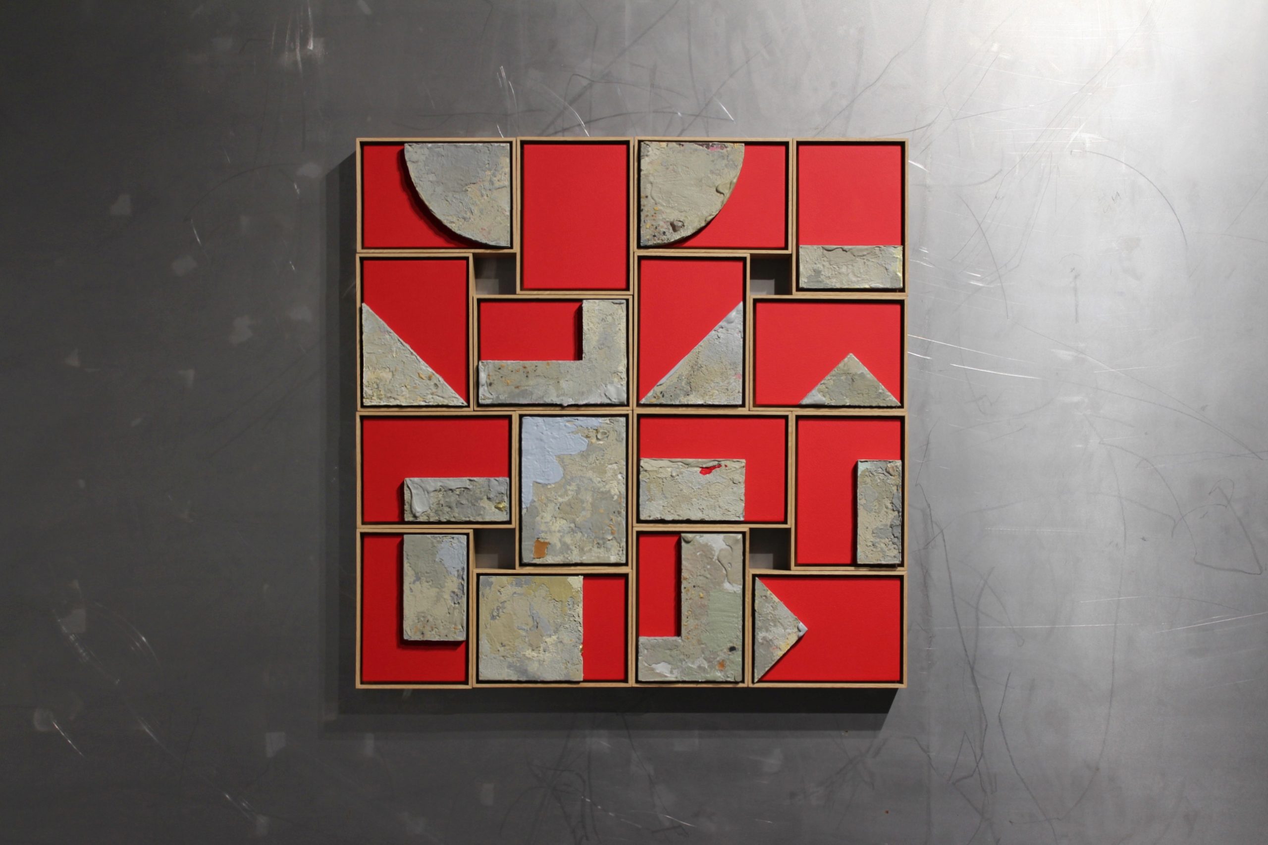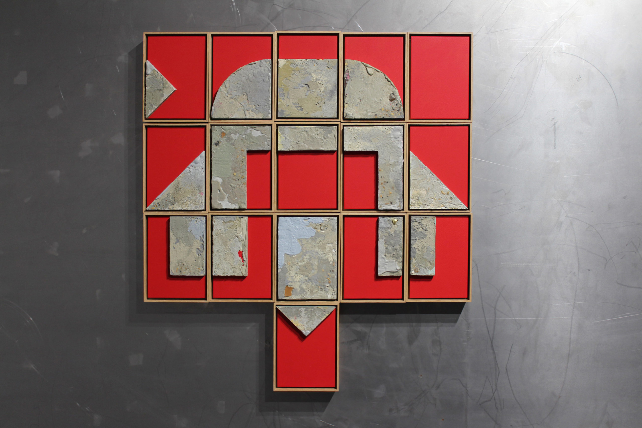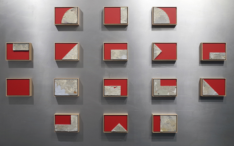‘Playtime’ is an attempt to address Tati’s 1967 critique of French Modernism . It consists of 16 magnet-backed works on a steel sheet and 4 ‘free standing paintings’ on a plinth, both depicting hyper-realistic slabs of demolished Robin Hood Gardens concrete in varying states of neglect made to Le Corbusier Modulor dimensions. ‘Playtime’ will be continuously rebuilt during Art-o-rama by invited art world influencers, creating an infinitely dynamic and impossible to pin down proposition.