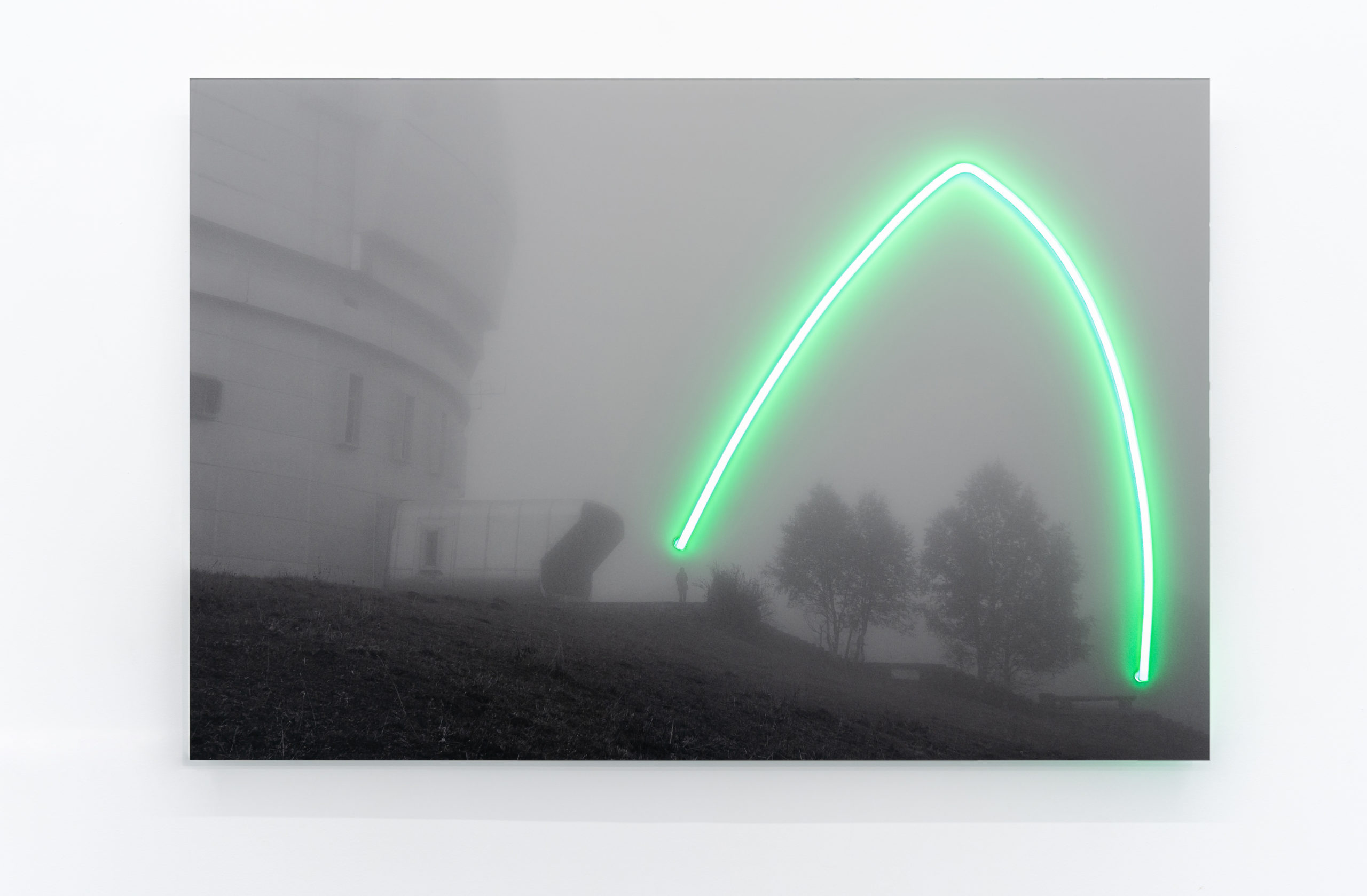 With science fiction and autobiography elements, Monosov creates nostalgic, anti-futuristic photographs donning neon green light reminiscent of low budget sci-fi films. By depicting unknown landscapes, the artist triggers feelings of strangeness in the viewer – “Would this green light pull the small figure standing on earth up to the sky?”