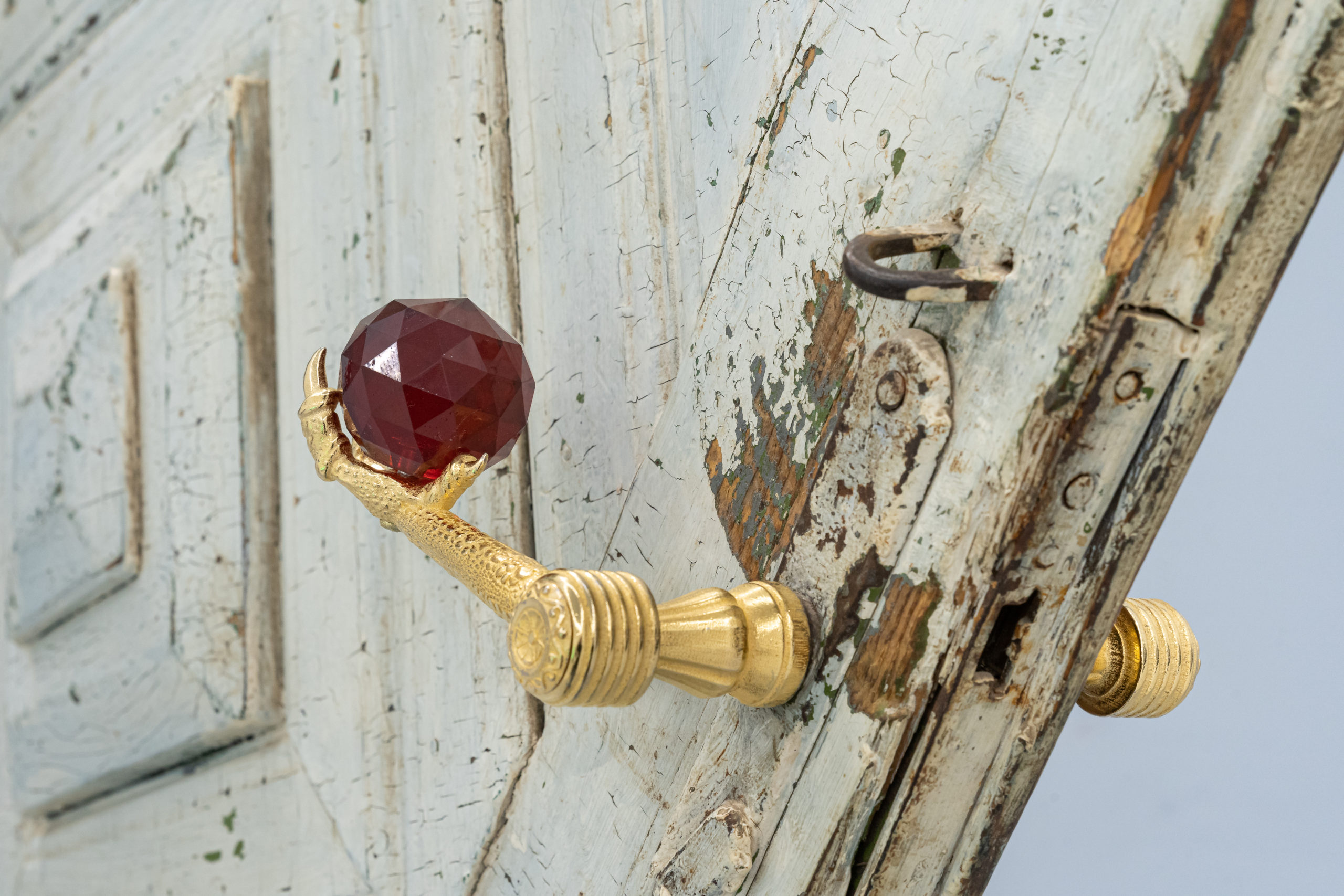 Another sculpture in the space is a replica of a set of door knobs used as functional, decorative objects inside the Hermitage Museum. Displacing these objects from their original context bestows upon them different meanings. Here the door knobs are attached to a 100+ year old Romanian door from Bucovina (an area on the border with Ukraine, formerly belonging to the USSR), drawing parallels between the two communist states and asking questions about the state of things 30 years later. The sculpture is rendered nonfunctional as the door leans in the middle of the space, unable to “open” anything. The work is also desperately separated from its original symbology of opulence as the feet of the eagle on the 17th century Tsar’s flag as Monosov’s use of 3D-printing to recreate the object renders it “cheap” and reduces the value of hierarchy.
