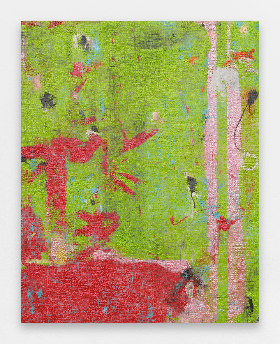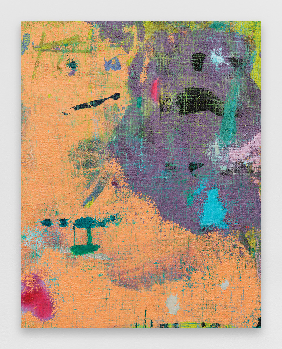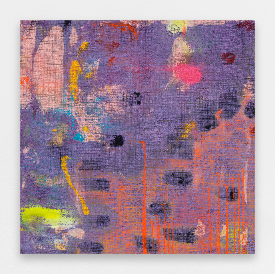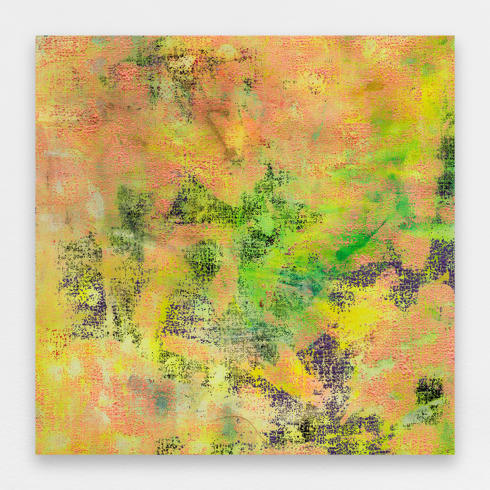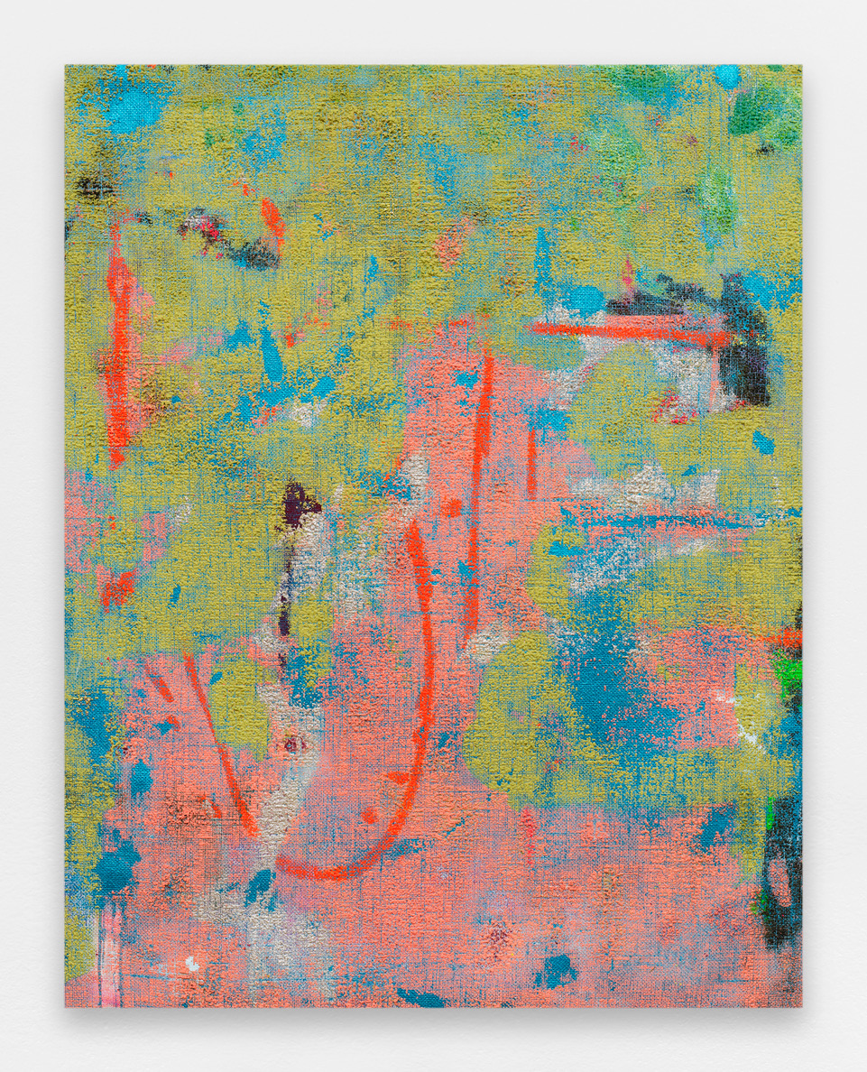 As often in his work, Momein’s new series of paintings entitled Lining revolves around a “lowly” material, hemp canvas in this case. The artist applied his colors on the back of the canvas, popping them through this grid with all sorts of tools used to enhance the color in the form of drops or touches depending on the viscosity of the material. The grid structure of the canvas takes on a ghostly presence, and the colors of the painting cover every part of the surface. The few areas left blank interrupt and alter the relationships between the surfaces. The result is a strong contrast between the rough canvas dyed in the mass and the paint stopped in its flight. The color is then transferred and seems captured by the canvas as it tries to expand. There is no flat tint here. On the contrary, it is a collide of colors, a juxtaposition, and a confrontation. The color is not new in Momein’s work, but his palette develops and reveals itself in his Lining works through pure abstraction and colorful materiality.