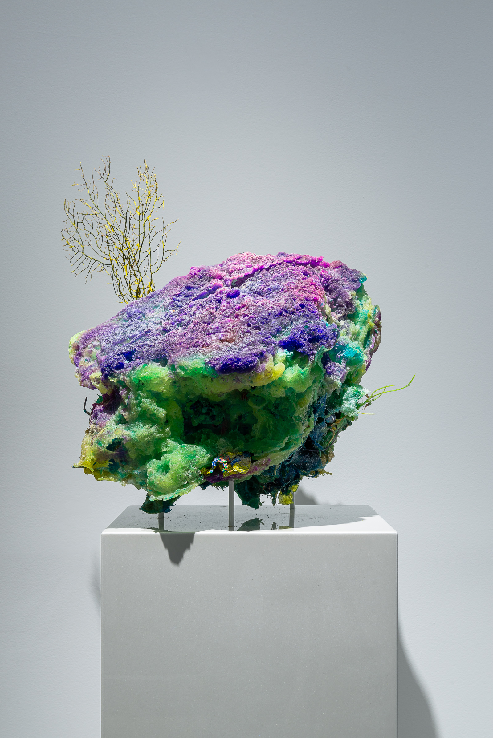Like many cosmogonic myths, Ugo Schiavi’s story begins with water. All forms of life originate from the sea, and the artist, like a modern demiurge, also extracts his molding matter from the sea. The Gorgones emerge from water: they resemble rocks or thousand-year-old shellfishes whose fascination dwells in their mysterious and garish bodies. In medieval bestiaries, creatures born from the encounter of fantasy and empirical experience have hybrid features, derived from the combination of various natural or imaginary parts. Similarly, the Gorgones are curious, charming sea creatures in which sadly familiar artificial elements like plastic bottles blend with natural organisms such as shells and gorgonians – the corals that take their name from the myth of Medusa. In this visual calembour, Ugo Schiavi plays with a suspended archaeology, presenting the fossils of a toxic present. To build his creatures, the artist has used the objects – including a large amount of plastic waste – deposited by the sea on the shore of Lavéra (Martigues, Marseille) where the biggest petrochemical plant in Europe is located. Indeed, the Gorgones are parts and emblems of the paradoxical loop of plastic which originates from the seashore and eventually returns to the seashore.