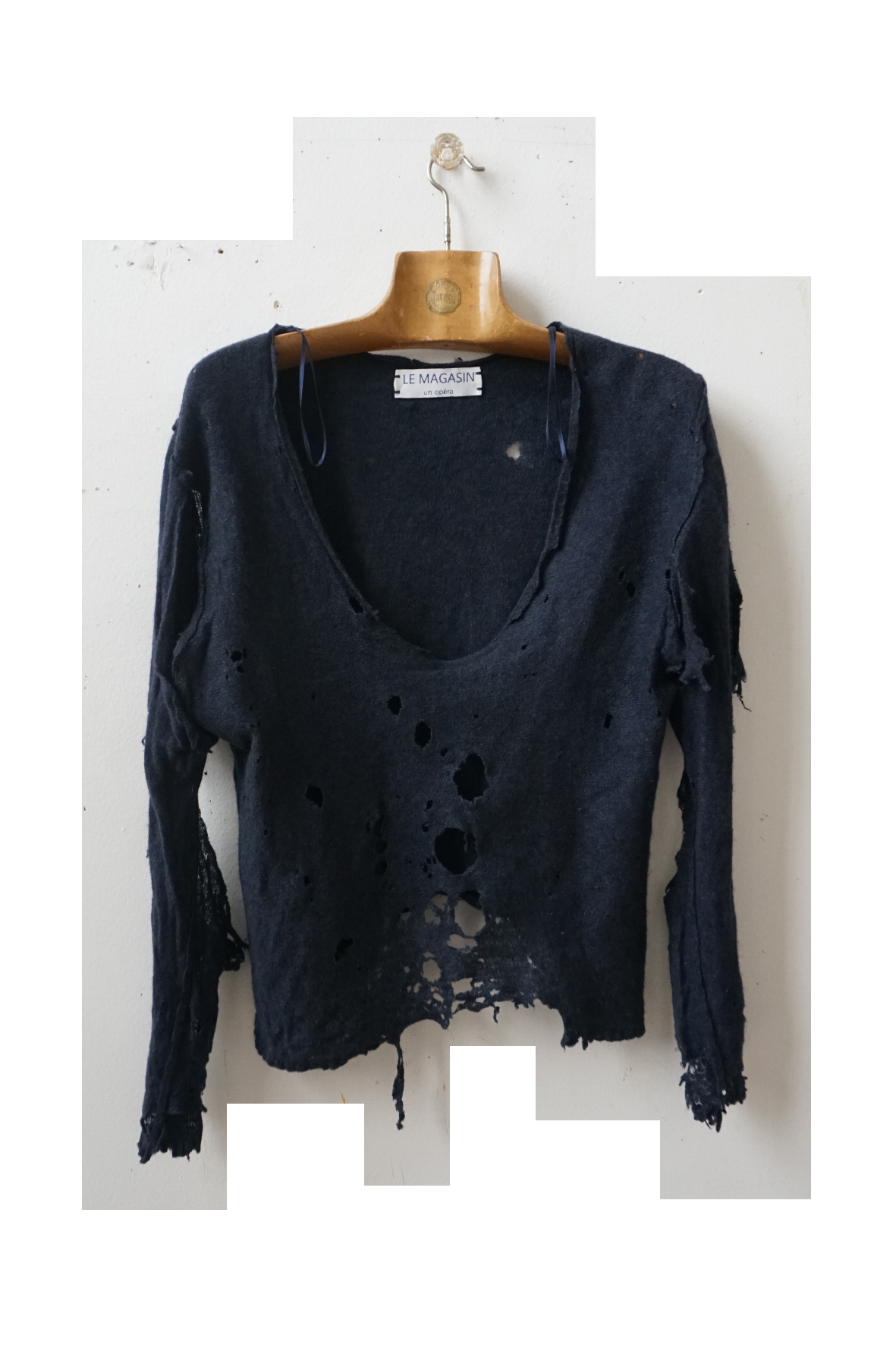 The cardigans, jumpers and sweaters on display are (more or less) pre-loved, worn out, shrunk by the washing machine, with large and small holes and of different qualities. Most of them come from les Puces de Montreuil, a flea market in the suburb of Paris soon to be taken down for Olympic sport competitions.