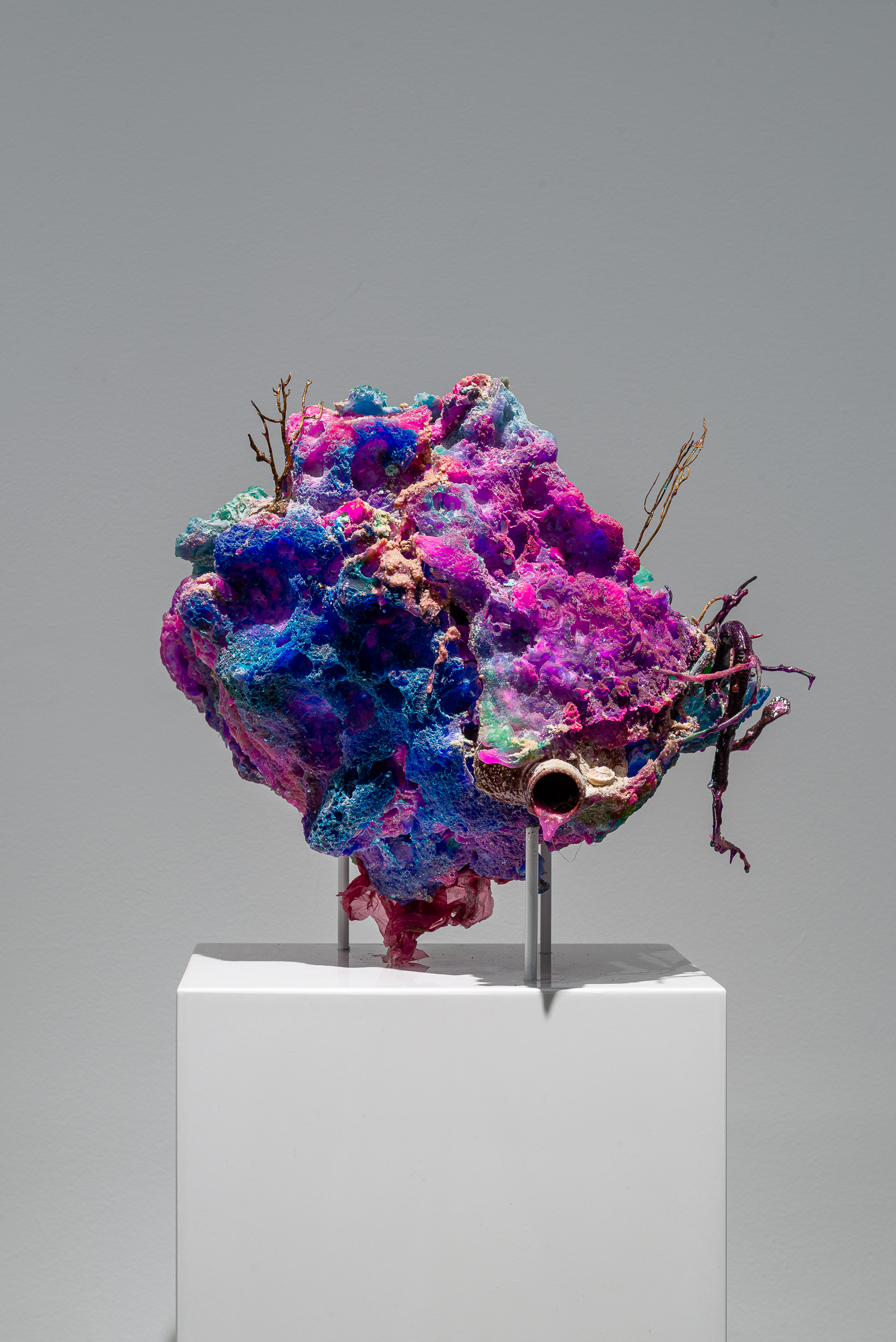 « Comme de nombreux mythes cosmogoniques, les histoires d’Ugo Schiavi débutent avec l’eau. Toute forme de vie prend son essence dans l’eau, et l’artiste tel un démiurge contemporain modèle aussi sa matière première à partir de cet élément. Les Gorgones émergent de l’eau : elles ressemblent à des roches millénaires dont le potentiel fascinatoire réside en leurs corps mystérieux et criards. Dans le bestiaire médiéval, les créatures naissent d’hybridation, entre fantasmagorie et réalité. De la même façon, les Gorgones sont de curieuses et charmantes créatures marines dans lesquelles des éléments artificiels tristement familiers, comme des bouteilles en plastique, se mêlent à des organismes naturels tels que des coquillages et des gorgones – les coraux qui tirent leur nom du mythe de Médusa. Dans ce calembour visuel, Schiavi joue avec une archéologie suspendue, montrant les fossiles d’un présent toxique. En effet l’artiste a utilisé une grande quantité de rebus plastiques déposés par la mer sur le littoral du golfe de Fos, où se trouve l’une des plus grandes zones industrielles d’Europe, productrice de PVC. Les Gorgones symbolisent le paradoxal itinéraire du plastique, produit grâce au sel de l’eau de la mer qu’il finira par polluer. Comme pour lui donner une chance de renaître, Ugo Schiavi retrace l’évolution de l’humanité à travers ses gloires et ses échecs à travers un récit fictif à la fois puissant et effrayant. Dans ses précédents travaux, le sculpteur s’est principalement confronté à l’histoire réelle, empruntant aux figures héroïques, symboles de courage et de gloire – mais aussi d’orgueil humain. Il porte aujourd’hui son attention vers la nature et passe de l’histoire à la légende, comme pour chercher un chemin parallèle, une alternative possible. Ainsi, les Gorgones sont à la fois des découvertes archéologiques et des souvenirs du futur, des fragments d’écosystèmes dystopiques.