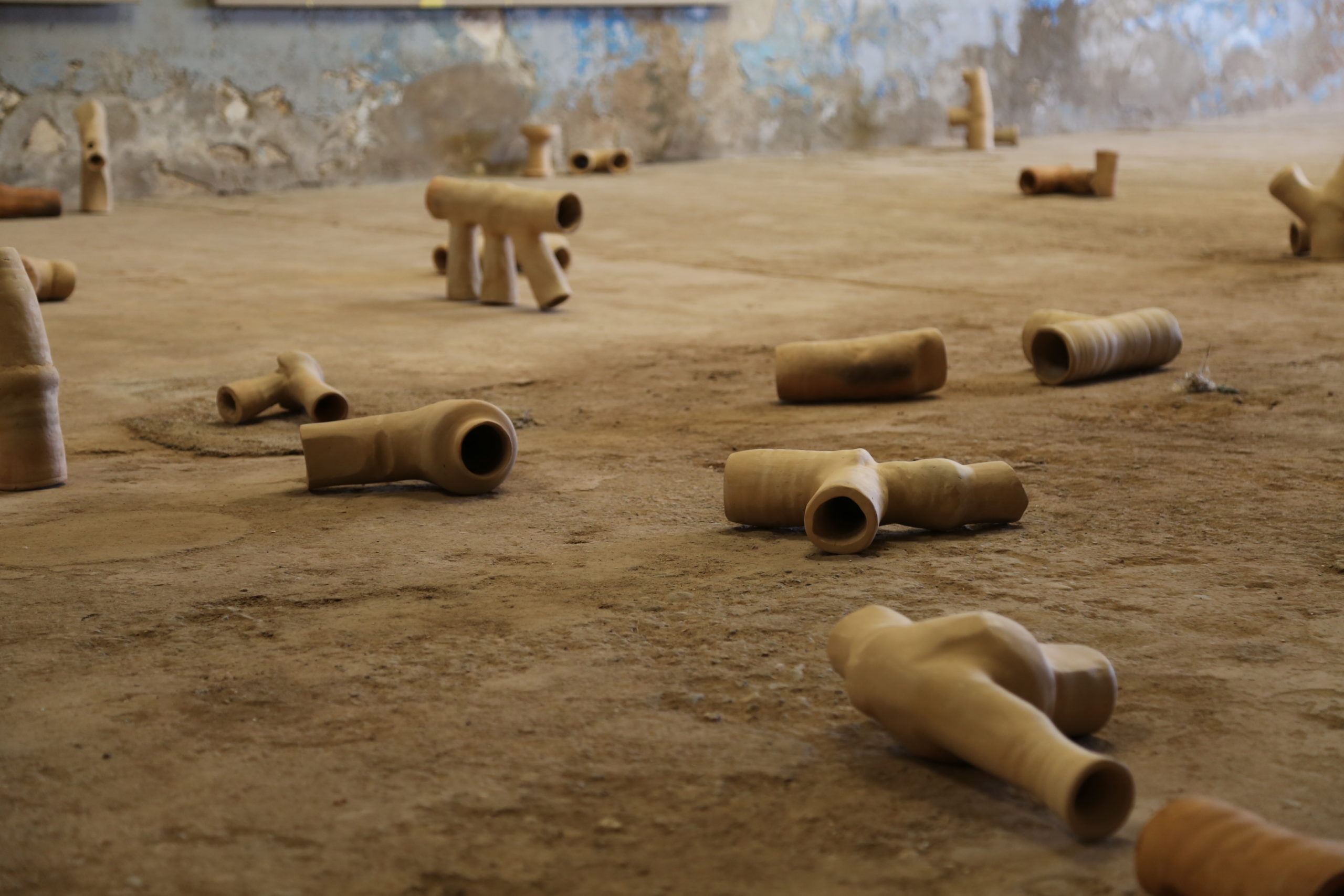 Partant de leurs rencontres avec un chercheur dans le patrimoine hydraulique et plusieurs habitants de la région du Désert d’Agafay, au Maroc, qui dans un film dessinent des plans schématiques tout en leur dressant un récit de l’organisation sociale de la maison et des besoins en eau qui y sont liés, les artistes ont imaginé un ensemble de sculptures en céramique inspirées des points de jonction de ces réseaux de canalisations traditionnels.